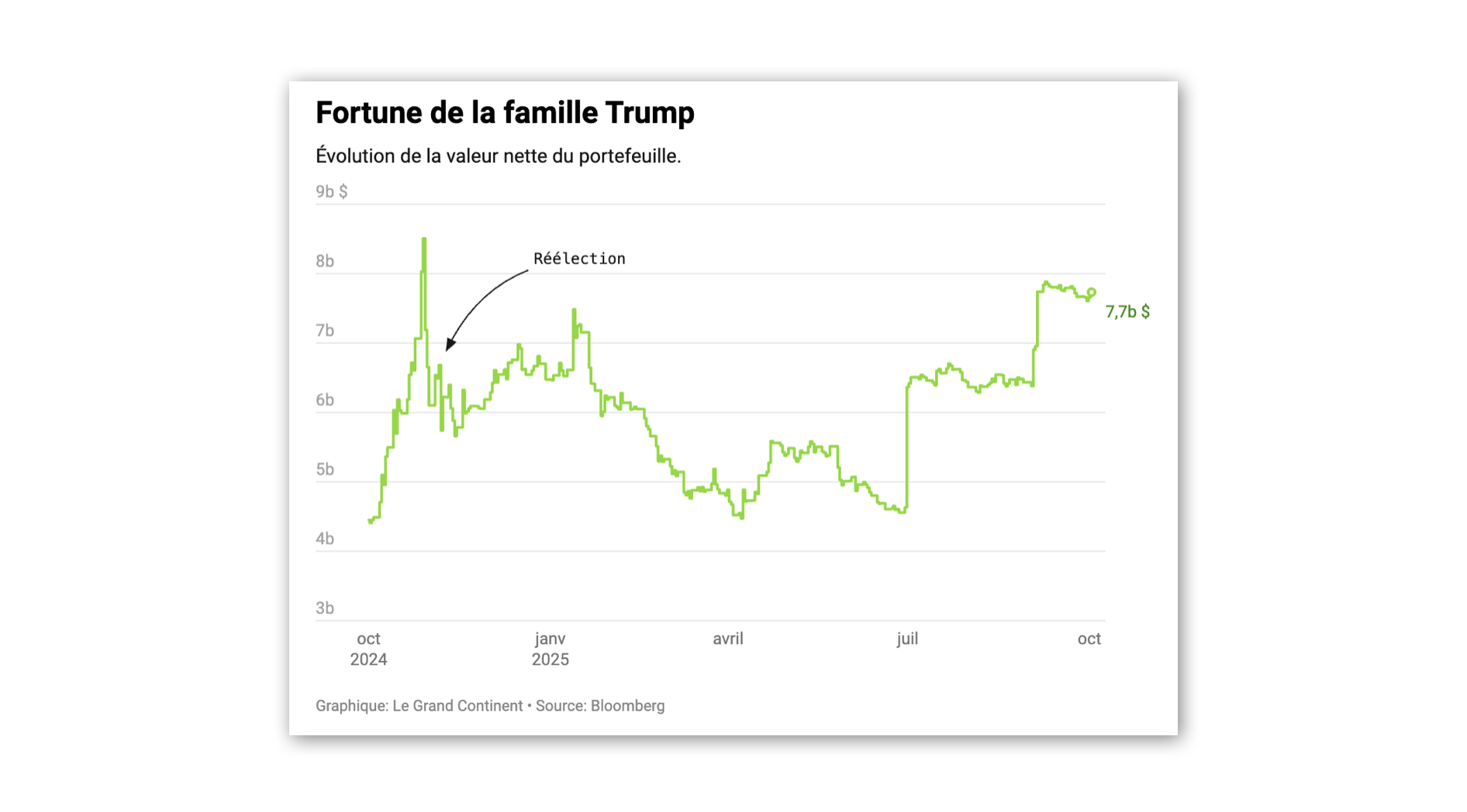 La fortune de la famille de Donald Trump a presque été multipliée par deux au cours de l’année passée : celle-ci atteint aujourd’hui plus de 7,7 milliards de dollars, contre 4,4 milliards en octobre 2024 — ce qui place la famille présidentielle parmi les 500 plus grandes fortunes du monde. Toutefois, l’opacité entourant les diverses activités lucratives des Trump complique l’établissement d’un chiffre définitif, qui pourrait dépasser les 10 milliards de dollars.